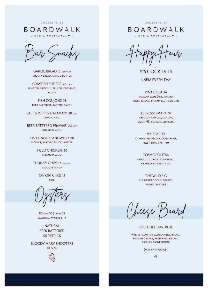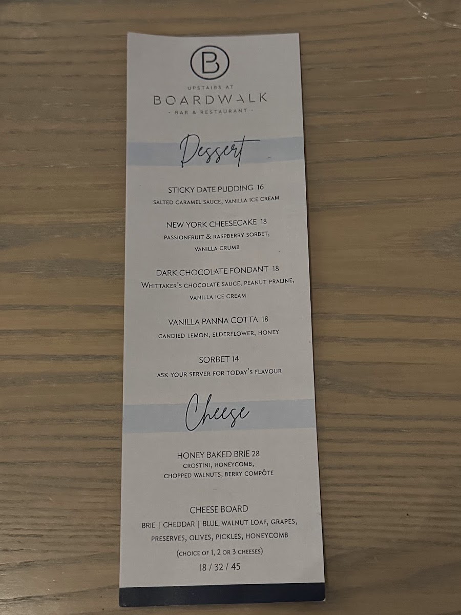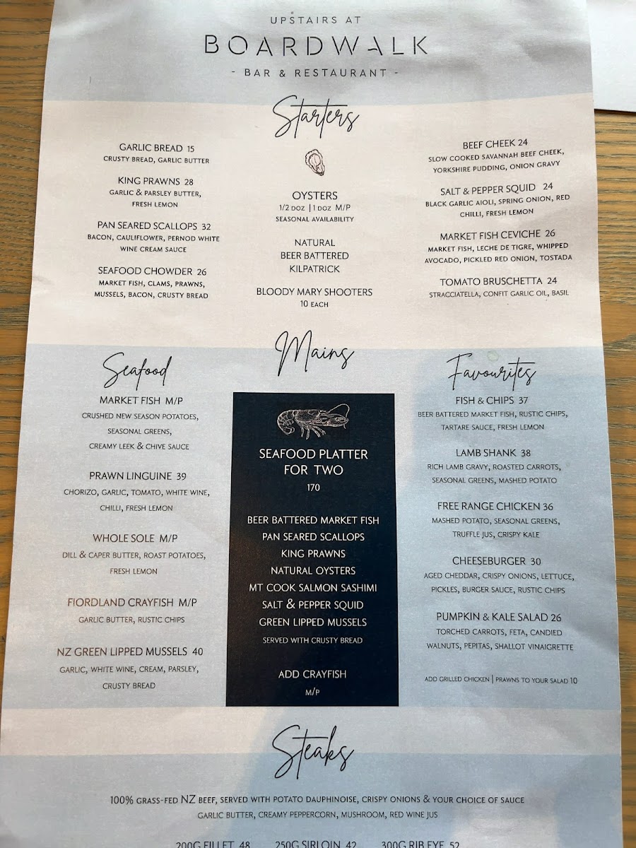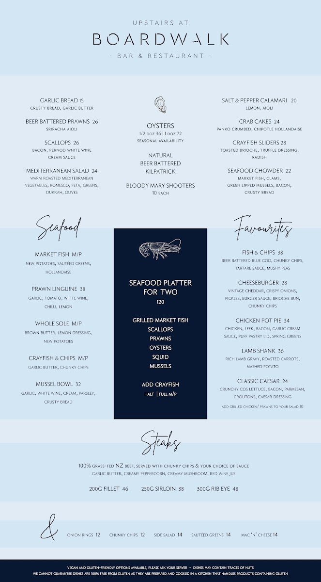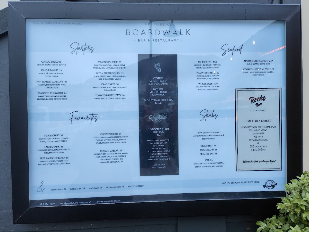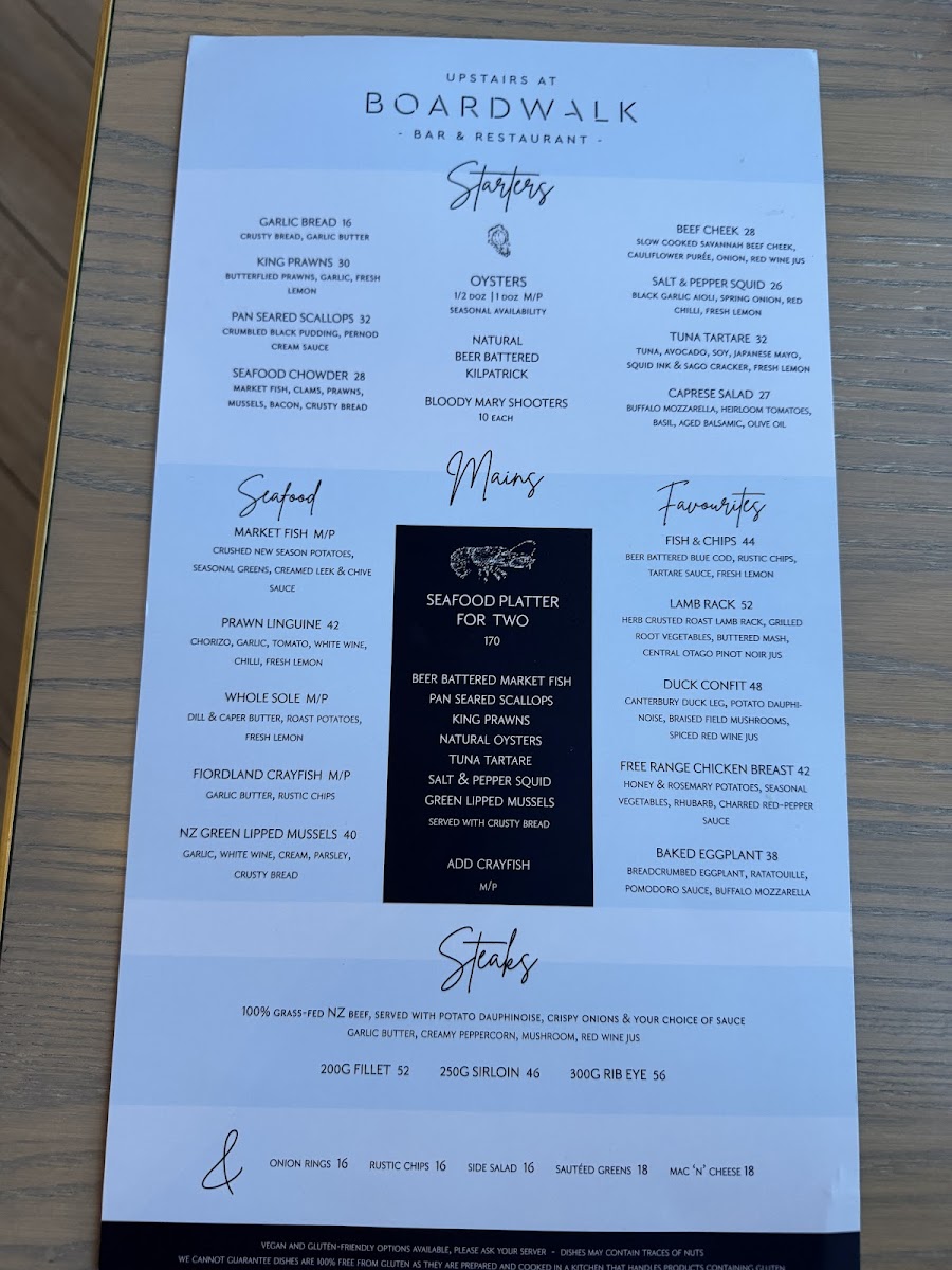 Welcome to Boardwalk, a delightful dining experience nestled at Steamer Wharf in Queenstown, New Zealand. This charming restaurant boasts stunning waterside views, elevating your culinary adventure. The menu features an array of enticing starters, including **garlic bread** and **pan-seared scallops** with a luxurious Pernod cream sauce, perfect for setting the stage. For mains, the slow-cooked **beef cheek** and fresh **seafood chowder** are standout choices, impressing diners with their rich flavors.